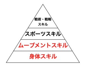 例えば、戦術スキルを獲得するためにはその真下にあるスポーツスキル(その競技の技術。バスケットボールであればシュートの技術、パスの技術、など)が土台として身についている必要があり、そのスポーツスキルを獲得するためにはムーブメントスキルがなければいけない、、、ということです。